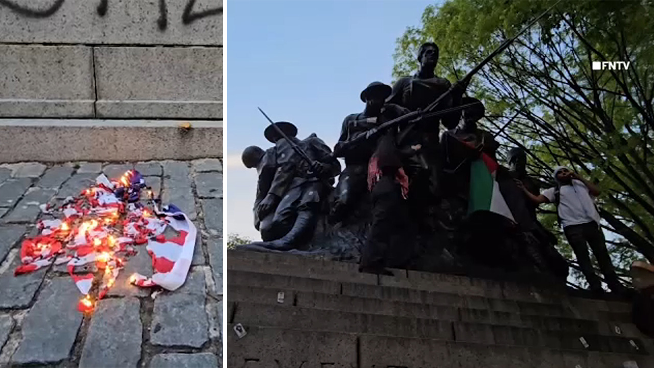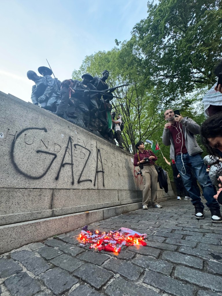 Protesters sprayed “Gaza,” “Free Palestine,” and other graffiti on the base of the World War I memorial. art-for-a-change.com+2CBS News+2